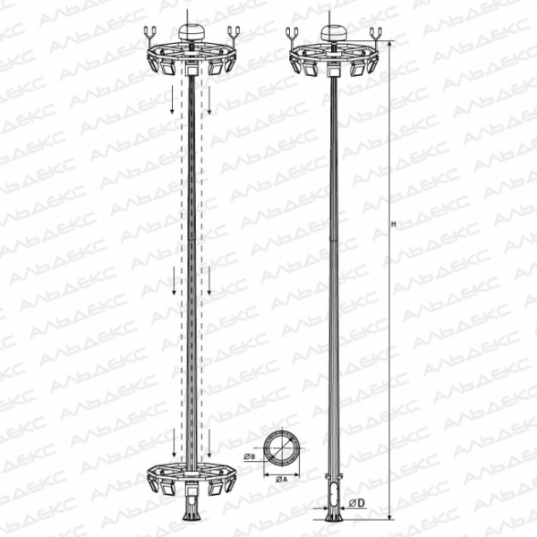 Фланец: Диаметр окружности высокомачтовой опоры освещения ВМО-25-В — сложные конструкции высотой 25 м, снабжаемые мобильной короной, дополнительной системой, посредством которой осуществляется фиксация светотехнического оборудования и которая при необходимости может быть приближена к земле всего одним работником. Изделия рассчитаны на достаточно большие боковые и вертикальные нагрузки, однако их монтаж допускается лишь в тех районах, степень ветрового воздействия в которых не превышает VII степени. При соблюдении всех условий эксплуатации изделия могут прослужить около