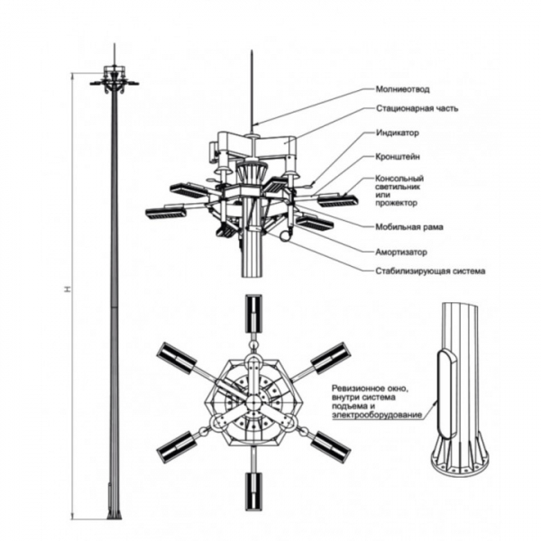 Высота высокомачтовых опор МГФ 35 метров. Их грузоподъёмность составляет до 800 кг. Количество прожекторов в каждой опоре — до 12 штук.